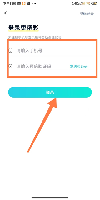 4、在手機號登錄信息填寫界面,輸入手機號和驗證碼,點擊登錄按鈕,即可完成手機號登錄操作。