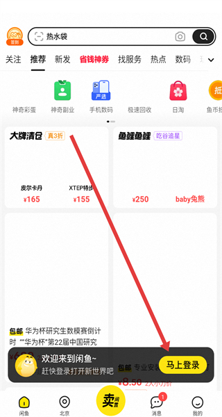 2、在進入到咸魚首頁中,可以點擊下方馬上登錄按鈕,準備開始進行登錄操作。