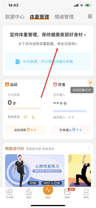 1、打開萬步健康,在健康頁面的體重管理板塊,點擊快去記錄吧。