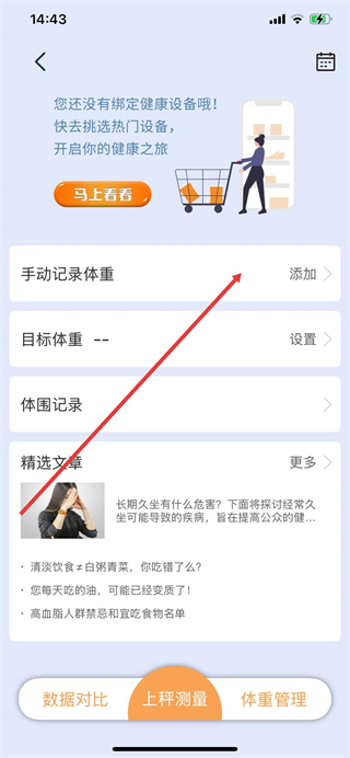 2、進入記錄頁面后,點擊手動記錄體重右側的添加選項。