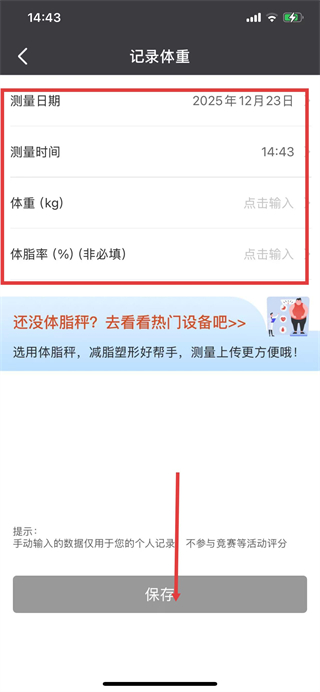 3、在記錄體重頁面,輸入體重,確認日期和時間后,點擊保存。