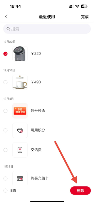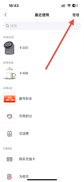 3、在最近使用頁面,點擊右上角的管理選項,進入足跡記錄的選擇操作狀態。