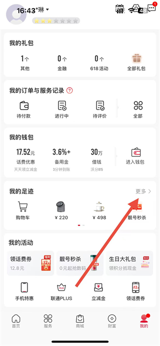 2、進入我的頁面后,在我的足跡區域找到更多選項并點擊,進入最近使用的足跡列表頁面。
