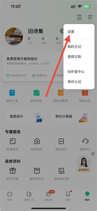 1、進入土巴兔APP我的頁面,點擊右上角三條橫線的菜單按鈕,選擇設置選項。