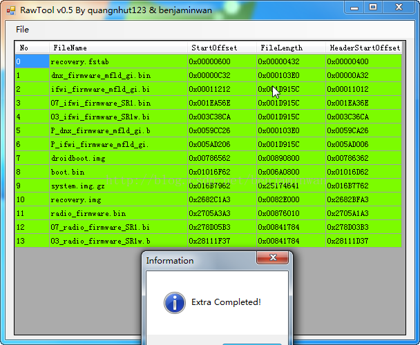 6.因為修改后的raw文件內容發生了變化,所以文件的校驗信息也變了,但目前不知道其校驗的算法,所以最后一步,還需要把組合好后的raw放入asus的工具中(本人沒有asus的手機或平板,所以具體不清除是什么樣的工具),會提示校驗錯誤并顯示正確的校驗值。再把正確的校驗值記下,輸入到工具的File->PatchCRC功能里,把修改后的raw文件打補丁,修改成正確的校驗值。之后就可以正常刷入了。
