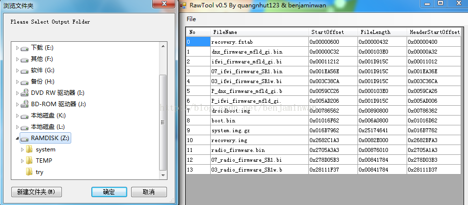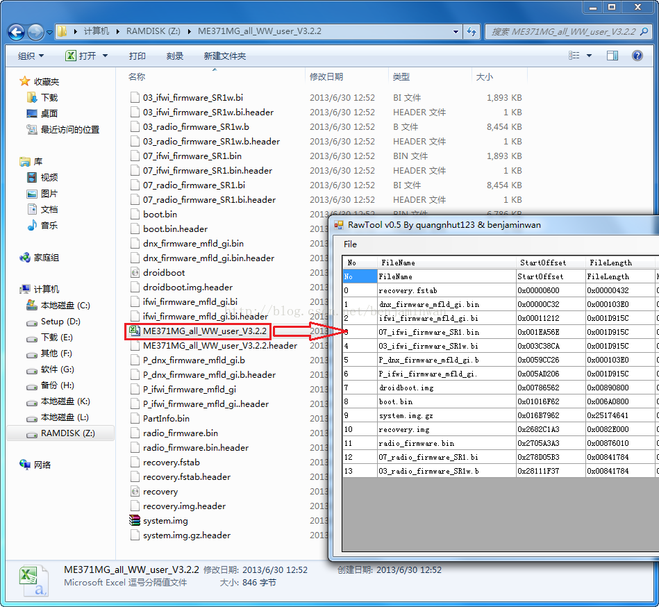 5.解壓后的文件夾里,有個與ROM文件名相同的csv文件,此文件記錄了raw解壓信息,用鼠標左鍵拖拽到rawtool窗口,可以再將解壓后的文件再次組合成raw文件。
