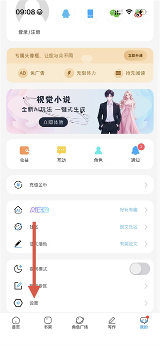 1、在APP底部導航欄點擊寫作圖標,進入我的作品頁面,頁面頂部展示作者福利,話本杯征文等活動下方設智筆創作作者福利等功能入口。