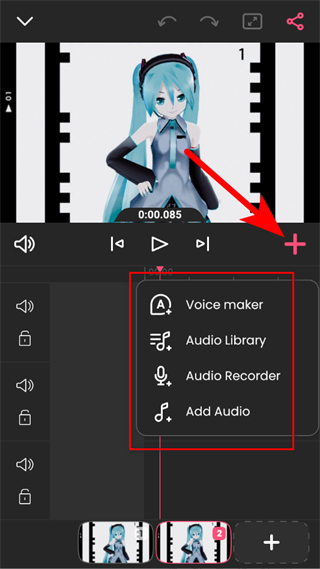 3、在音頻操作頁面點擊右上角粉色加號按鈕,彈出音頻導入選項菜單。