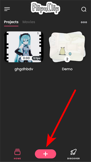1、打開Flipaclip應用,在主界面點擊底部中間的加號按鈕,開啟創建新項目操作。