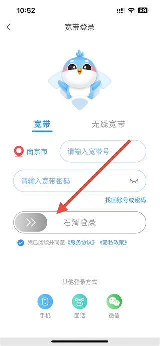 4、勾選已閱讀并同意相關協議后,右滑登錄按鈕即可完成寬帶賬號登錄。