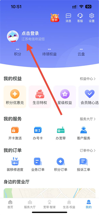1、打開天翼生活APP,在我的頁面點擊點擊登錄。