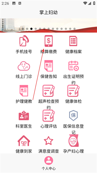 1、打開掌上婦幼APP,點擊結算繳費選項。