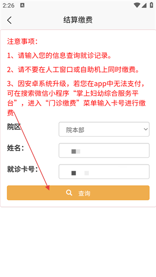 3、自動輸入姓名、就診卡號,點擊查詢,即可查看繳費記錄。