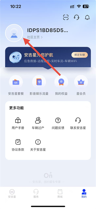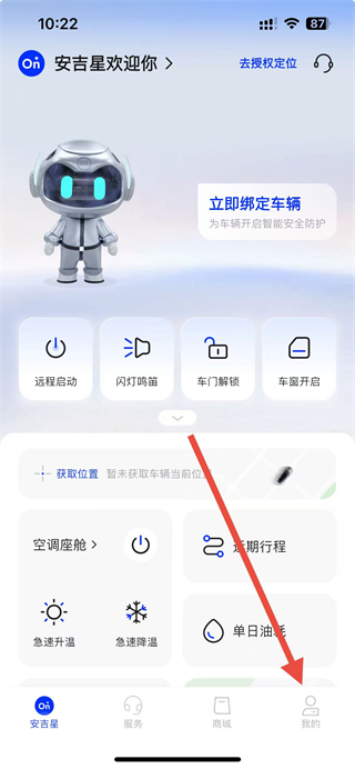 1、進入安吉星app,點擊首頁底部我的選項,進入我的個人頁面。