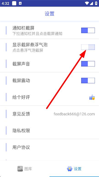 2、在設置頁面中,點擊顯示截屏懸浮氣泡的開關。