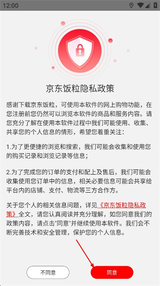 1、打開京東飯粒后,閱讀彈出的隱私政策內容,確認后點擊界面中的同意按鈕。