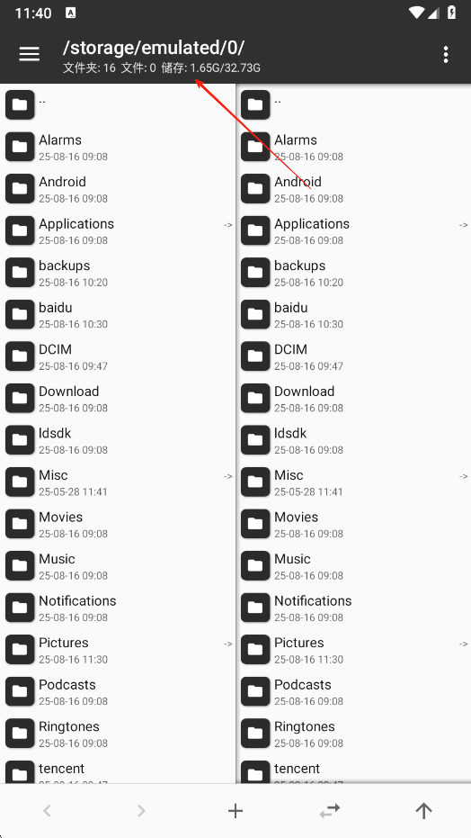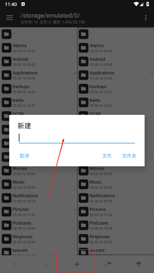 2、進入文件瀏覽界面,能看到各類文件夾,如Alarms、Android等,若要新建內容,點擊底部+按鈕,在彈出的新建框中輸入名稱,選擇文件或文件夾進行創建。