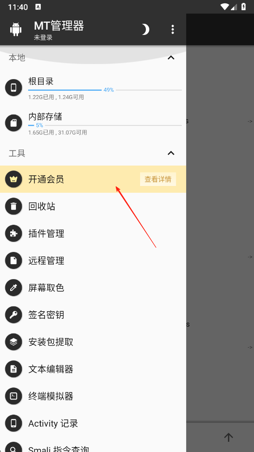 1、打開MT管理器,可查看根目錄和內部存儲的存儲使用情況,根目錄已用49%,內部存儲已用5%,還有豐富工具選項,若想開通會員,點擊開通會員可查看詳情。