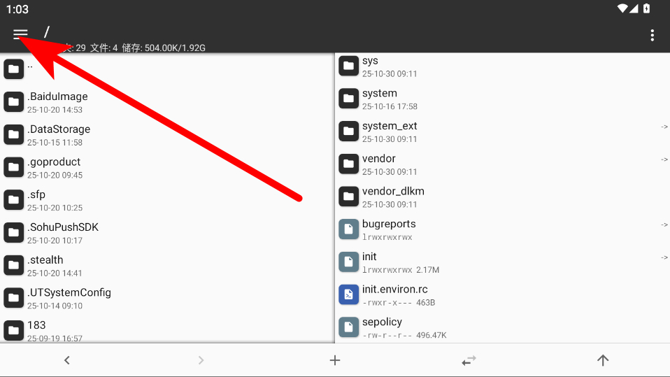 1、在MT管理器文件界面,點擊左上角菜單按鈕,展開功能列表。