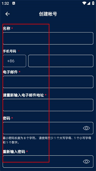 3、在創建帳號頁面,輸入名稱、手機號碼、電子郵箱、密碼并再次輸入密碼。