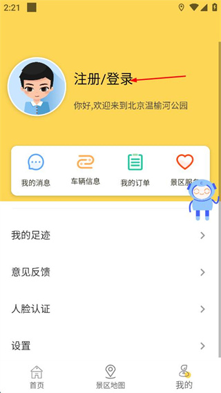 3、在我的頁面中,找到注冊/登錄區域,點擊該區域進入對應登錄界面。
