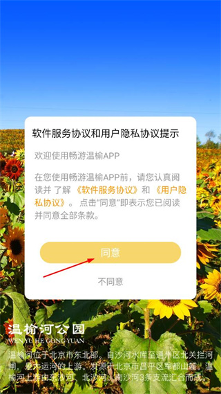 1、打開暢游溫榆出現協議提示彈窗,閱讀條款后點擊同意按鈕進入軟件。