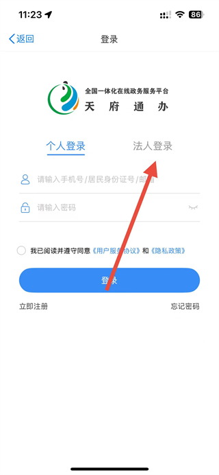 2、在登錄界面,點擊法人登錄選項卡,切換至法人登錄模式。