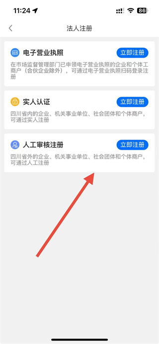 4、在法人注冊頁面,選擇對應注冊方式,點擊立即注冊按提示完成流程。