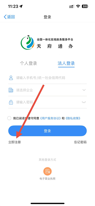 3、在法人登錄頁面,點擊左下角的立即注冊選項,進入法人注冊頁面。