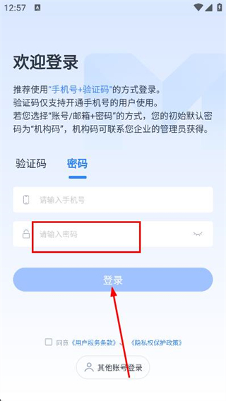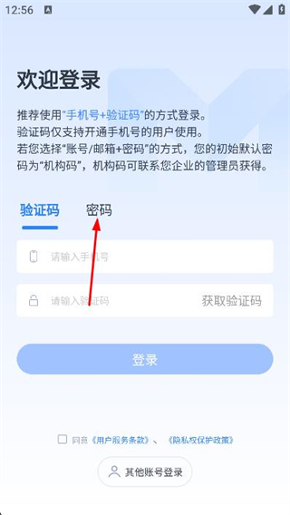 1、打開m云學習app,在登錄頁面中,點擊密碼選項。