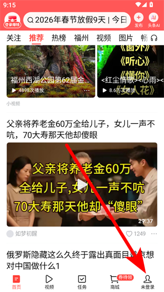 1、在今日頭條首頁,點擊未登錄我的選項,進入個人相關頁面。