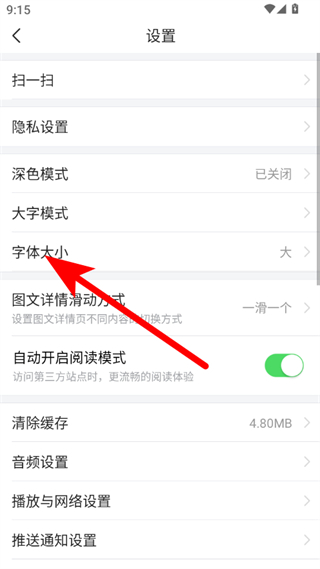 3、在設置頁面,點擊字體大小選項,進入字體大小預覽頁面。