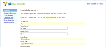 現在到了Yii轉變你的數據庫模式進入功能性的PHP代碼。使用內置的WEB代碼生成器,你也可以把數據庫表的定義立刻轉變成模型類,不用編寫一行代碼。這個模型類將允許您使用面向對象的風格訪問數據庫表。