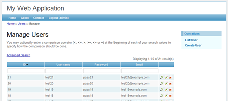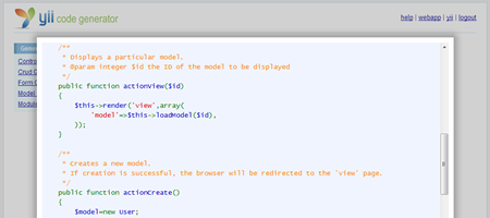 使用上述代碼生成器,您可以進一步產生代碼,對選定的數據表實現了典型的CRUD(創建,讀取,更新,刪除)的特征。生成的代碼是高度可用的和可定制的,證實了well-adopted MVC設計模式(model-view-controller)。 再次,Yii做了所有的創建工作而不需要你寫一行代碼。