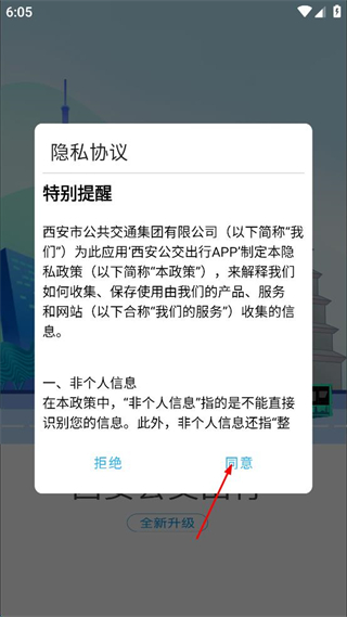 1、打開西安公交出行APP,查看彈出的隱私協議內容,確認后點擊同意按鈕進入主界面。