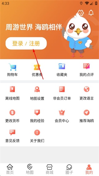 2、在我的頁面中,找到登錄/注冊按鈕并點擊,進入注冊流程的輸入手機號頁面。