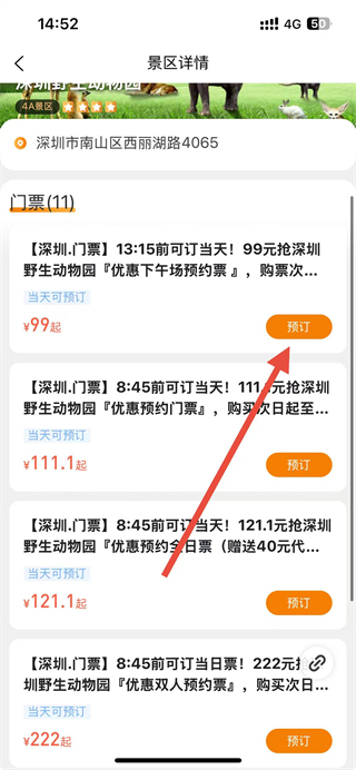 4、在景區詳情頁面,選擇門票類型后點擊預訂,按照提示完成購票操作即可。