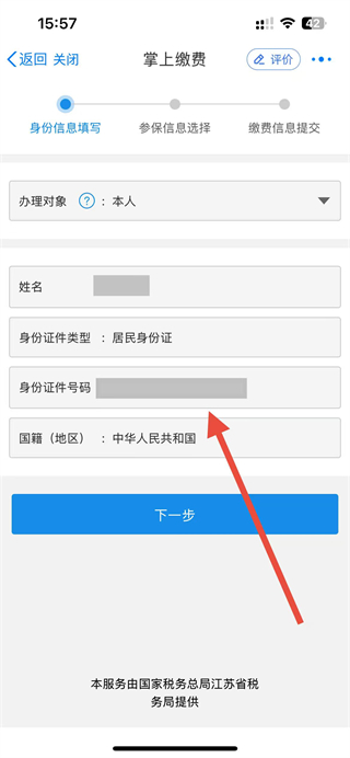 3、進入掌上繳費頁面后,填寫信息,點擊下一步按鈕,按照后續提示填寫即可提交繳費。