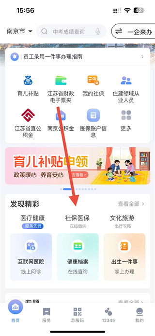1、在應用的首頁界面中,找到板塊下的社保醫保分類,點擊進入社保醫保功能。