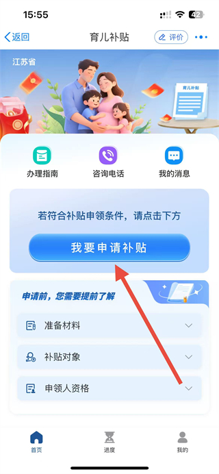 2、在育兒補貼頁面,點擊我要申請補貼按鈕,進入申請流程說明頁。