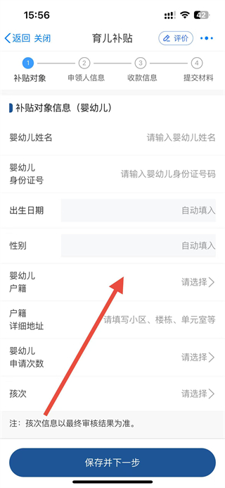 4、填寫完補貼對象信息后,點擊保存并下一步,依次完成申領人信息填寫,最后上傳相關材料并提交申請。