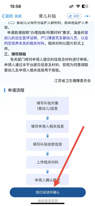 3、在申請流程說明頁,閱讀完畢后點擊我已閱讀并確認按鈕,進入補貼對象信息填寫頁面。