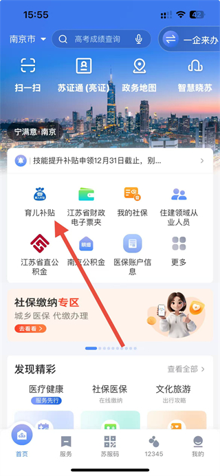 1、在蘇服辦app的首頁界面中,找到育兒補貼選項并點擊,進入育兒補貼的專屬辦理頁面。