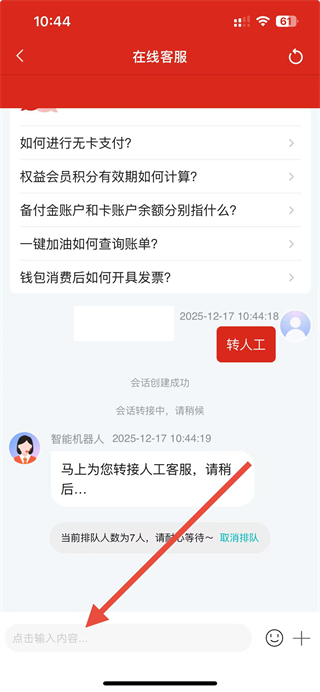4、點擊后等待會話轉接,耐心等待排隊,點擊輸入框發送問題與人工客服對話溝通。