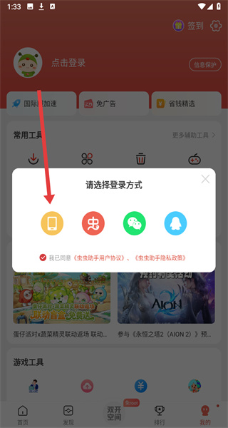 1、打開蟲蟲助手,閱讀隱私協議后點擊紅色同意按鈕,進入應用開啟游戲探索之旅。