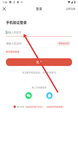 4、跳轉到手機驗證登錄頁面,點擊輸入框填寫手機號,在獲取驗證碼填寫后,即可點擊登錄按鈕完成登錄。