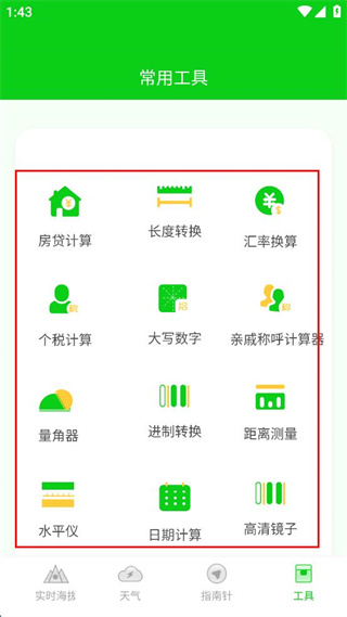 海拔gps指南針同時提供指南針和天氣預報,以便大家外出獲取到生活的基本信息。分不清的東南西北或者戶外出行的人很適合這款app。還有房貸計算,尺子,鏡子,水平儀,匯率換算等小功能等你來體驗哦!