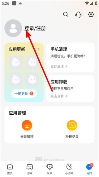 2、進入我的頁面后,找到并點擊上方登錄/注冊區域。