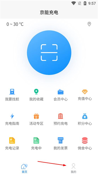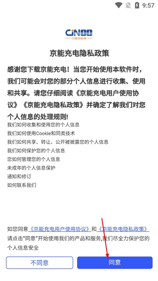 1、打開京能充電應用,在隱私政策頁面找到同意按鈕,點擊該按鈕,進入應用首頁。