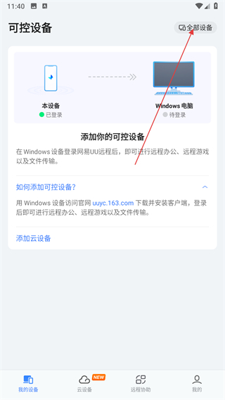 1、進入我的設備界面,可查看已登錄的本設備和待登錄的Windows電腦,若要添加可控設備,使用Windows設備訪問官網uuyc.163.com下載并安裝客戶端。